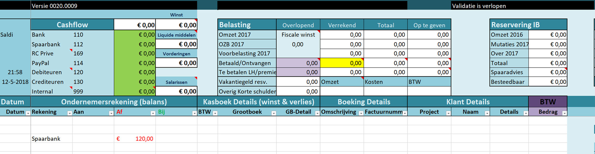 In dit exceldocument heeft u een helder overzicht hoe u ervoor staat.Wat gaat u volgend jaar aan inkomstenbelasting betalen, welke facturen staan er nog open of hoeveel staat er nog op uw bankrekening. Ook kunt u hier makkelijk met filters en zoekfuncties eigen overzichtjes maken, b.v. een overzicht van alle kosten en inkomsten van een bepaalde klus, om te zien wat het nu echt heeft opgeleverd.